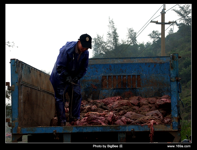 这次鲸鱼的解剖对环保方面做得不错,割出来的鲸鱼肉全部都转运到填埋场深埋掉,防止发生二次污染,这是垃圾车在转运鲸肉
