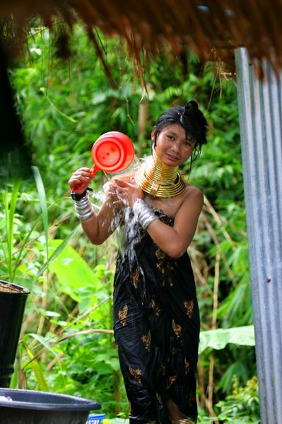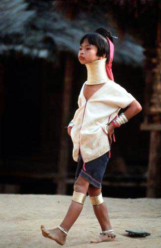 克扬族女人认为这种习俗完全可以接受。“一开始是又疼又重,不过最后总能适应。”莫波说,“最苦的是在天热的时候,铜圈热得烫人。”这种时候她们只有到河水里泡一泡,才能给铜圈降降温。假如不这样做,即使天气凉快下来,被阳光烤热的铜圈仍会把一阵阵热浪传到全身。