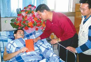 本报广州12月1日讯 记者罗艾桦摄影报道:“平清,你好,我们代表你所在的海珠区人民看你来哪!你是英雄,你是我们区的骄傲!”12月1日上午,广州海珠区副区长陈高生率区民政局和赤岗街负责人前往广州番禺大石人民医院看望见义勇为、身负重伤的广东教育学院退伍兵大学生张平清,并献上鲜花(见图)。