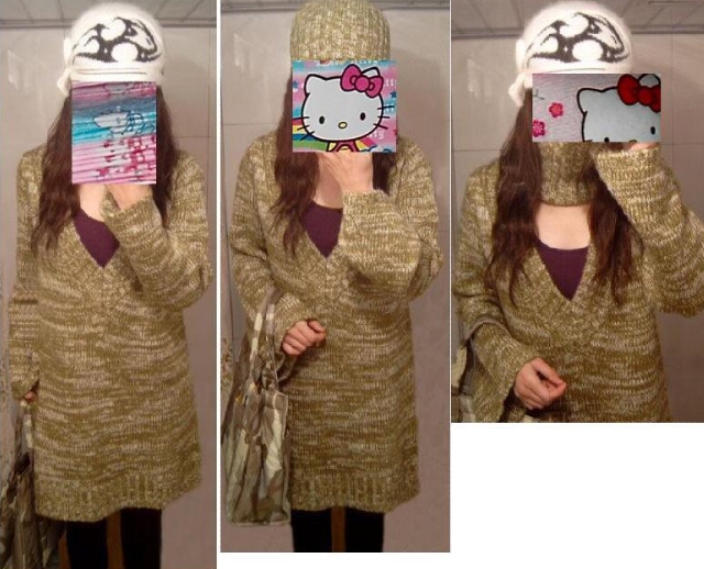 • 韩国版★荷花袖淡绿+白 大V字型长款毛线衣也可当毛裙 225$.jpg