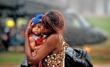 “卡特里娜”飓风给美国造成了严重的人员伤亡和财产损失。在“卡特里娜”飓风于8月29日袭击墨西哥湾地区三天后,巴哈姆抱着她的女儿走下直升机。直升机将她们从新奥尔良飓风灾区转移了出来。作者:奥乌尔克