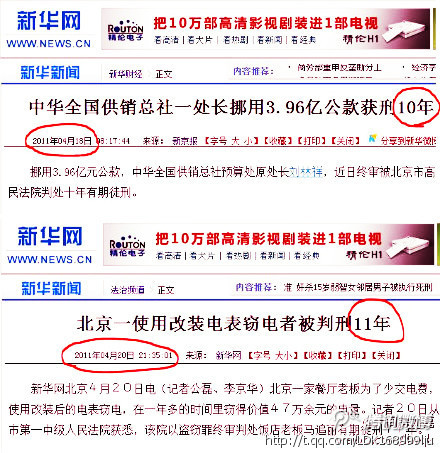 新华网:2011年04月18日,挪用3.96亿公款获刑10年。仅仅两天后,04月20日,改装电表偷电被判刑11年。。。