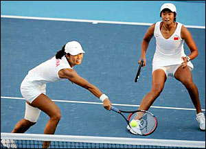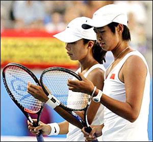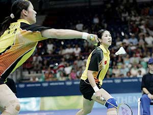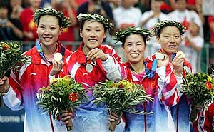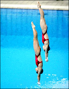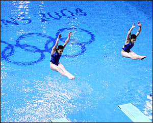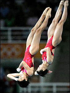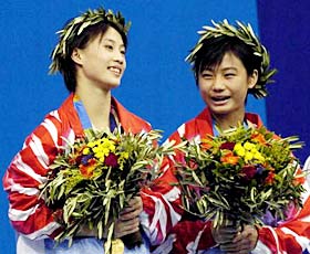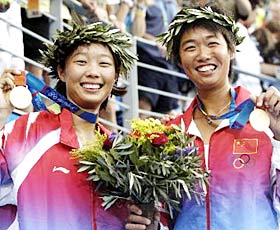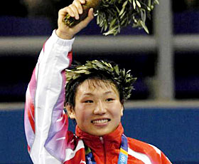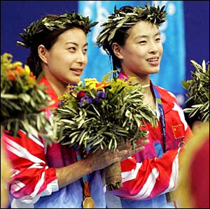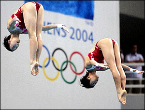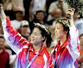 雅典时间8月14日消息,巴塞罗那世锦赛冠军郭晶晶和吴敏霞今日在雅典奥运会上为中国跳水队打响头一炮,轻松赢得女子3米板双人金牌。郭晶晶与吴敏霞在比赛中以完美的表现征服裁判与观众站到最高领奖台上。两个人的5个动作共得336.90分,击碎了俄罗斯选手贝拉・伊琳娜和尤利娅・帕卡琳娜的卫冕之梦。这对俄罗斯选手获得银牌,澳大利亚的尚泰勒・纽伯里和伊琳娜・拉什科获得铜牌.