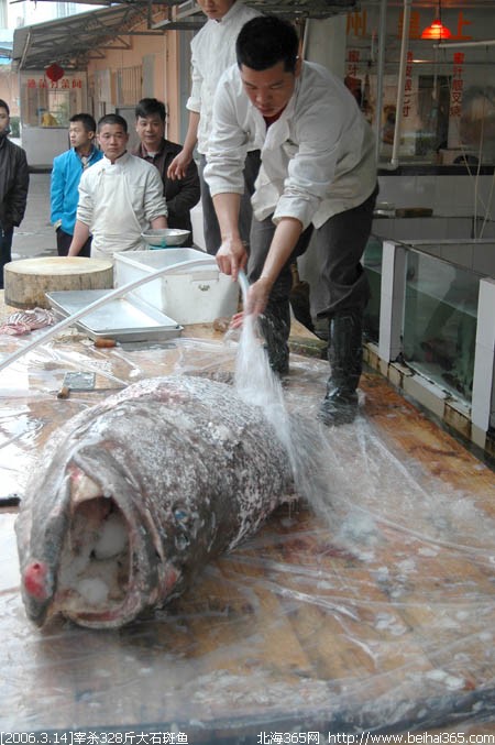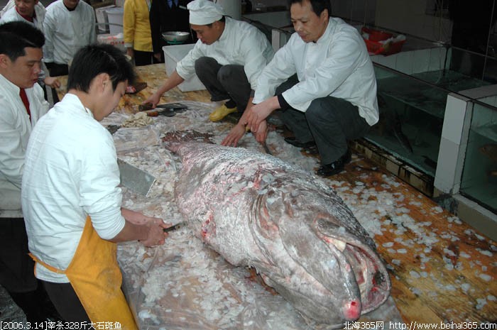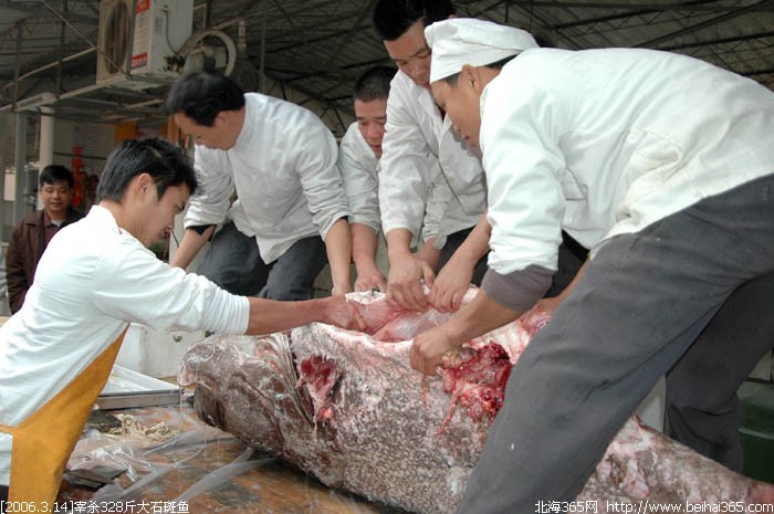 昨天在合浦捕获的328斤重超级大石斑鱼被北海肥佬时街购得。并于今天下午4点,现场宰杀,俺拍下了整个宰杀大鱼的过程,场面有点血腥,要做好心理准备哦。如果你耐心看完了整个帖子,说明你是很有胆识的人!