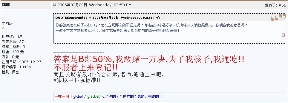 在电白也有一位,就是号称"supergirl88"的一位老师.想毕她是想当superwoman(女强人),但那也太老了吧.于是就凑合着用这个名.她的杰作就是将我们要小学生理解的"纯利,利润,利润率"等同于"营业毛利率,营业利润率,资产报酬率,资本金利润率."来解释......无语.