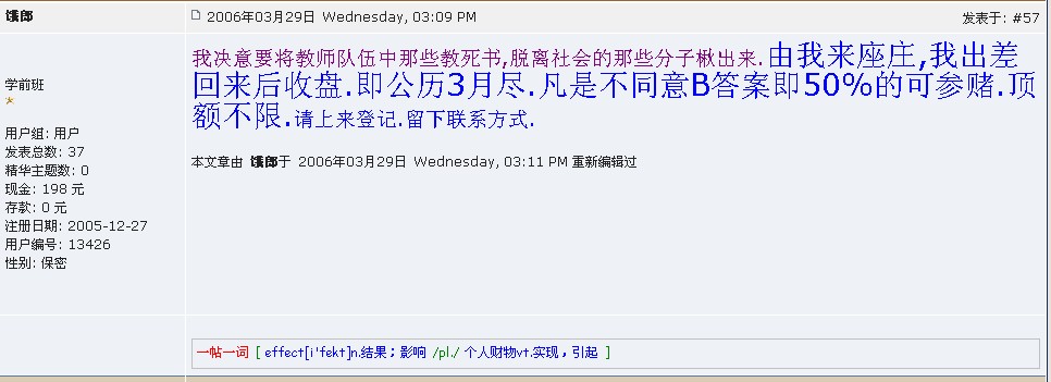 刚看题目我还以为是为电白教育基础出主意的好帖子,谁知一看象看到大便一样恶心。学术争论本来就是应该提倡的,至少经过民师考题的争论,我这个“数学盲”又了解多了很多知识,这是很好的事啊!为什么要如此狭隘?又是荤段子又是拿网名说事,为什么要让自己的粗俗暴露在众目睽睽之下!