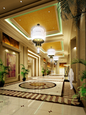 这个区域的重点应该在左边的仿古墙画上,建议将那三个小灯加大,使灯光能够直接打在画上,突出画,拉高大厅的高度;另外稍微减弱一下顶部弧形光的强度。