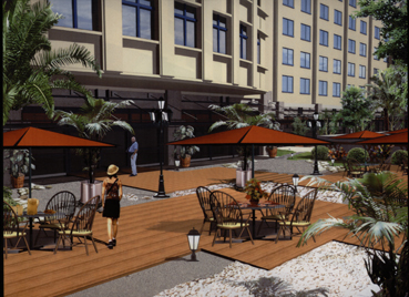 感觉:1.渲染得比较粗糙 2.建筑物缺少立体感 3.亚热带地区室外大面积连片使用木地板感觉有点不协调。4.大热天,不会有人介意室外公共场所的桌子上是否有盆花的,建议你可以省略。