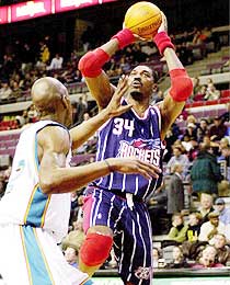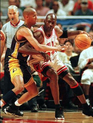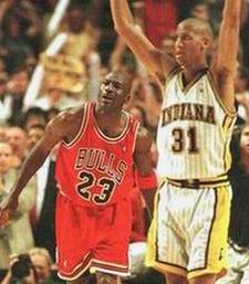 这里没有把马龙、托马斯、滑翔机列为乔丹的对手,而选了一个在NBA历史上无法与他们相匹敌的米勒,并不是他们不好,而是因为米勒是NBA中唯一一个乔丹永远也征服不了的对手。“大鸟”输给了乔丹后会说:乔丹是黑色的基督;“微笑刺客”会说:乔丹是联盟最好的选手。但米勒不会!那永不屈服的眼神里能看到的只有对乔丹的仇恨!而对乔丹来说,米勒就是他的眼中钉、肉中刺,因为只有他敢在比赛的最后时刻把自己推开,然后投中制胜一球,让自己颜面扫地。乔丹也许永远也想不通,为什么这个瘦瘦弱弱的小子竟然比佩顿、马龙、“魔术师”约翰逊、皮蓬还难对付,自己就算一次又一次的把他打倒在地,他也能毫不费力的再爬起来,然后说:下次我们再来! 这两个“心胸狭窄”的人之间永远不会有友谊,从场外的口沫横飞,到场上的拳脚相加,这两个人永远也不会和好,没什么原因,老子天生看你不顺眼!