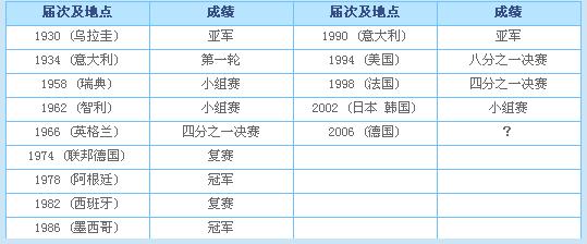 世界杯最好战绩:冠军(1958,1962,1970,1994,2002)