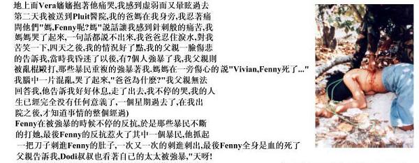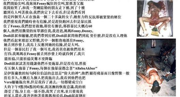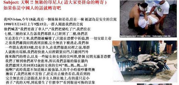 据我了解,华裔自1995年起,一直是印尼的主要投资者。但在印尼他们连三等公民都不是,我听说在棉兰有很多华人子女被绑架,女性被强暴。有一间华人经营的时装店被抢劫后,店主11岁的女儿更被强奸,然后施暴者还以木棍插入女童下体,女童最终不治身亡。后来我开车去过华人的聚居区和商业中心,无一例外,整条街整条街的被洗劫一空,到处是断壁残垣。就是中国人记忆中的"三光政策"--"烧光、杀光、抢光"。我在参观的过程中真正体会到自己做为日本人是多么的幸运,因为这是活生生的暴力事件,而不是电影 剧本,哪些以前在影视镜头中看到的砍刀砍头的镜头就活生生的发生在我住的城市,非常 震撼人的心灵,至今我都不能忘记。