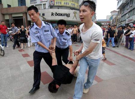 一便衣民警将抢夺犯罪嫌疑人抓获后向同事打电话求援 民警将抢夺犯罪嫌疑人抓获后带离现场 2006年6月9日下午,湖南省娄底市巡逻大队的民警和群众成功的将一名抢夺市民财物的犯罪嫌疑人抓获。当日下午6时许,一名抢夺市民财物的犯罪嫌疑人在娄底市九亿步行街进行抢劫时,被在此地段巡逻的娄底市巡逻大队民警和附近近百群众成功的将其抓获.其另外一名接应同伙看到情况不对后马上骑摩托车迅速逃离现场,娄底市警方对逃跑的另外一名犯罪嫌疑人正在进一追捕中。