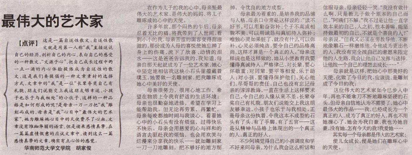 邹寿元(华师附中语文特级教师,广东省中语会副理事长):题目十分大气,有文学韵味,作为高考命题,起到了“一举三得”的作用:一是不偏,但能考出区分度。考生在作答这个题目时,材料的选择很宽泛,能多角度构思,可以是记叙、议论、编故事等;考生也可以写历史、写现实。因此,题目不容易让考生跑题,使有文学功底的考生容易得到比较好的分数。