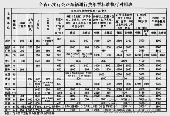 和广东省其它地方比较,茂名的年费标准太高,超出广州1到2倍。2009年,5吨至15吨的货车,茂名年费收费是5,000元;广州市则是2,880元。2吨或2吨以下的货车,茂名收费是2,400元;广州则是980元。