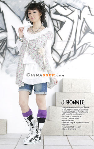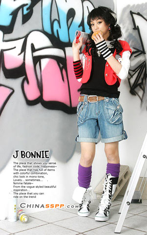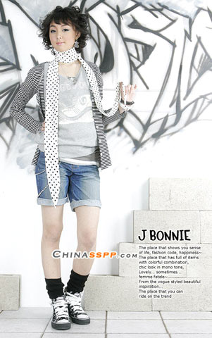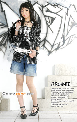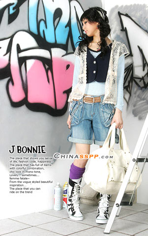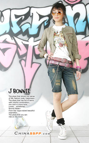 略显繁琐的服饰搭配掩饰牛仔的平淡, 侧面的金属珠链带来精致感觉