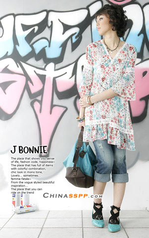 飘逸的印花上装, 干练时尚的牛仔7分裤,无需太多细节便成就淑女风范