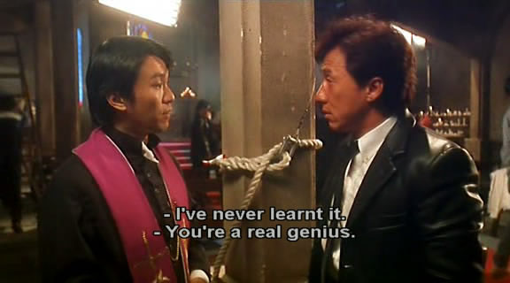 另外,成龙在影片里饰演一个咖喱菲,说“我没学过戏”,这是区别于周星驰周润发梁朝伟刘德华这些无线台艺员训练班的影人而言的。