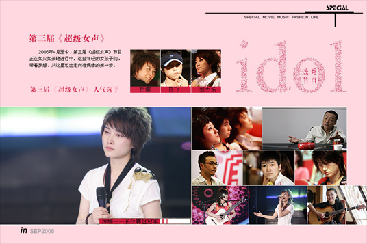 「IN」是让更多人认识你的可能性。在享受它快捷且方便的娱乐资讯的同时,亦呈现你最真实的自我,表达更鲜明的个性,令你生命沿途风景更精彩。 「In life, in me」,这一切不是错觉,其实就是你自己。 本期「IN」杂志将为大家介绍 “超女”、“好男”这样的选秀节目中新偶像诞生的过程和操作内幕,大量的独家照片,当然还少不了我们的“封面孔”,这次我们带来原创歌手林天爱录音棚精彩写真。