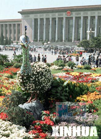 1986年10月4日,人民大会堂前用各色鲜花组成的孔雀花坛。