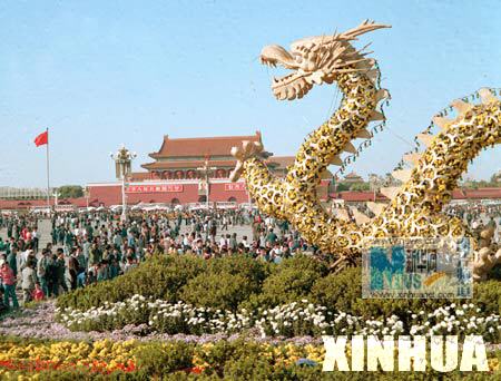 1990年9月22日,北京天安门广场上象征吉祥的凤凰造型花坛,
