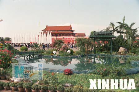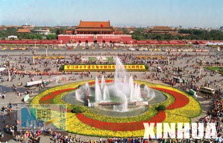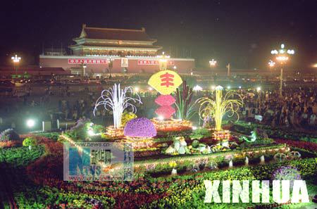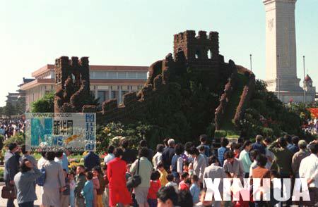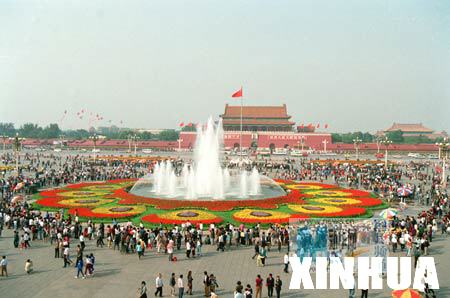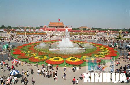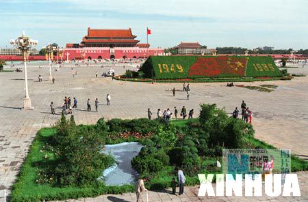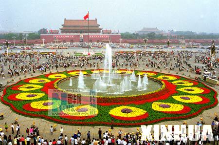 1991年9月30日,国庆节前夕,16万盆鲜花将北京天安门广场装点一新。