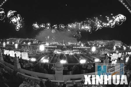 北京天安门广场举行有10万群众参加的国庆焰火联欢晚会。