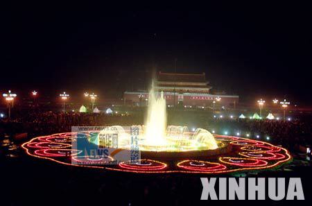 1986年10月4日,天安门广场中央设置的蒲公英状的喷水池,引得游人流连忘返。