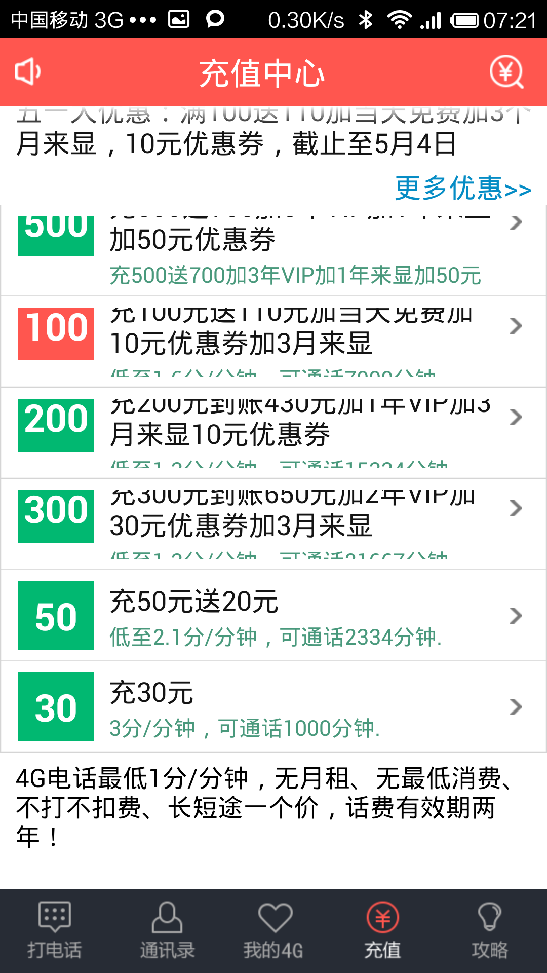4G网络电话资费不受主叫方的地理位置影响,只由被叫方的地理位置决定。无月租和漫游费用,无国内长短途之分,一律0.15 元/分钟。 但是,通常情况下4G网络电话官方会推出一系列充值优惠活动,一般折后价格为7.5分钱/分钟!