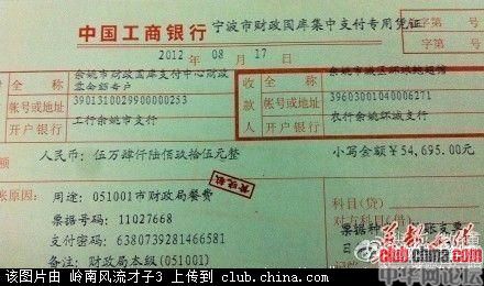 [上传一顿饭5万多转账支票图片的姑娘被银行开除】, 浙江余姚市财政局一顿饭钱花费54695元,引发多方关注。一个网友在微博上传了一张转账支票的照片,证据清楚,然而上传转账支票的照片者为工商银行的一小姑娘,现以被银行开除。这是反腐行为,揭露了相关领导的腐败,小姑娘被开除是官官相护后的报复惩戒行为。