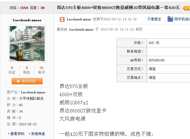 QUOTE(zcww15 @ 2012年02月22日 Wednesday, 07:33 PM) http://itbbs.pconline.com.cn/es/f45.html 欢迎各位上装B说的太平洋论坛对比价格. CPU4 641 一般100块上下 内存:100上下 主板:945集成90上下,不集成60上下 160G并口120上下, 新机箱电源:100,不要可以-100,你可以自己重新买. 口说无凭,欢迎各位上太平洋二手论坛搜索对比,其中不免有快递交易,我想同城当面交易怎样都 比你和广州上面的人交易好吧..........就让某些继续B吧 [snapback]3326946[/snapback] 第一。能买这台垃圾就不会意味着会把你的机箱电源当新买。懂?~。全套机就个硬盘值个钱。。~第二。过保的东西。无分地界。。我就不信说买了你的机。用个把月出问题后。你会退?~。别把一时的装逼当事实。。。~这套无硬盘就个420块。随便添个40G 80G。也就几十块。凑合500块。 把你这台垃圾秒整个水东。~
