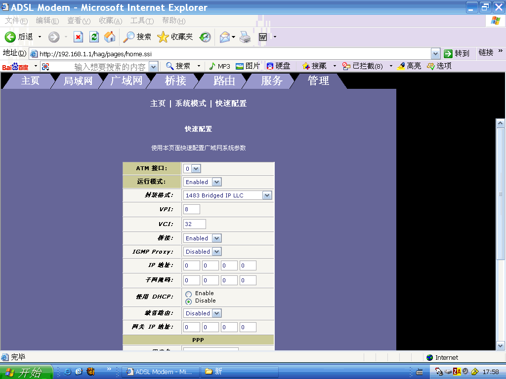 D dbr666 幼儿园 注册 2007-01-07 消息 1 反馈评分 0 点数 0 2007-01-07 #1 原来电信MODEM,刚报装铁通,MODEM要重新设置VCI:35改为32,提交后可拨号上网,但保存不了,每次都要重新设置VCI,是否电信做了手脚,还是其他原因?请大家帮忙 附件 adsl.gif 38.1 KB · 查看: 266 adsl2.gif 37.8 KB · 查看: 300