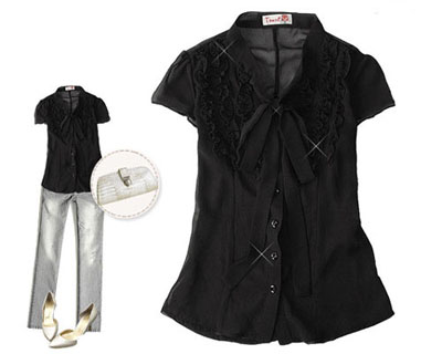搭配要点:适当束腰的衬衫让身材显得更修长,搭配古典式的耳环透露优雅典范。