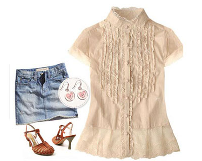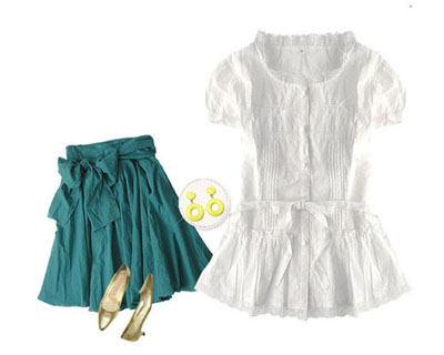 搭配要点:纯棉质地的衬衫搭配饰有蝴蝶结的长裙尽显邻家女孩般的清纯与质朴。