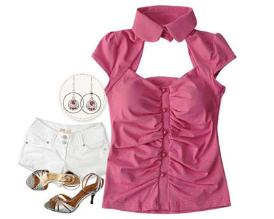 搭配要点:大胆的镂空+纯棉质地将性感演绎得活泼俏丽,再加上可爱的白色超短裤充分展露女性的柔媚风情。