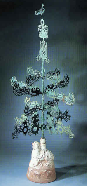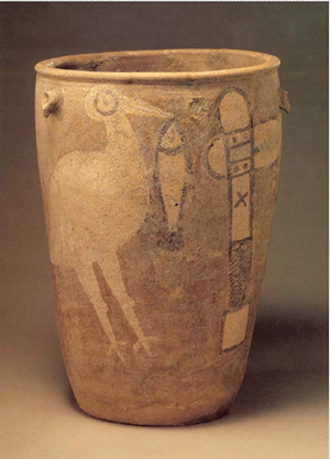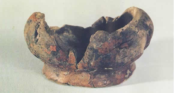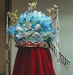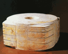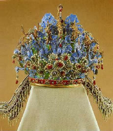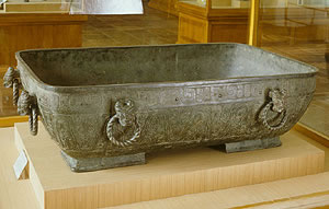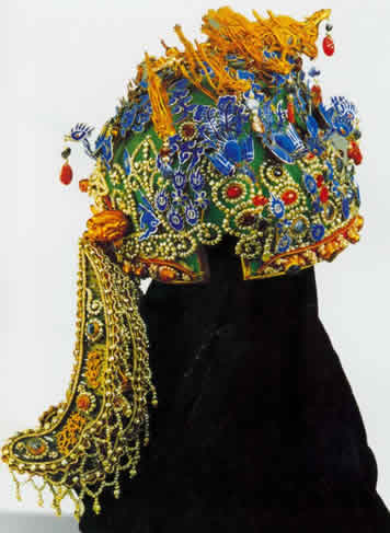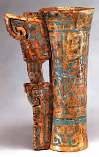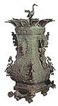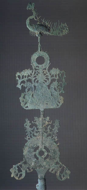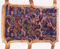 亦称:“五星出东方利中国”织锦护臂。汉晋时代。圆角长方形,绢缘,缝缀六角系带,长18.5厘米,宽12.5厘米,系带长21厘米,部分系带残断。护臂用面锦为“五星出东方利中国”文字织锦,五重平纹经锦,经密220根/厘米,纬密24根/厘米,宝蓝、草绿、绛红、明黄和白色等五组色经根据纹样分别显花,织出星纹、云纹及孔雀、仙鹤、辟邪虎等禽兽纹样,纹样题材新颖、风格别致;每组花纹循环为7.4厘米,上下两组循环花纹之间织出“五星出东方利中国”小篆文字。白色绢缘系用一通幅的绢条缝制成绢经密50根/厘米,纬密40根/厘米,系带经密60根/厘米,纬密28根/厘米。现藏于:新疆区考古研究所。
