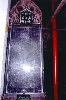 唐代。记述景教在唐代流传情况。此碑于唐建中二年(781年)由一个名叫景净的波斯传教士撰刻树立,吕秀岩书并题额,立于大秦寺的院中。碑高279厘米,宽99厘米,正面写着“大秦景教流行中国碑并颂”,上有楷书三十二行,行书六十二字,共1780个汉字和数十个叙利亚文。随着景教的没落,大秦寺的院落为佛教所用,此碑不知何时失落。明天启三年(1623年)出土,当时许多西方各国有不少的传教士得知后,争相拓片,把碑文拓片译成拉丁文寄往欧洲本国。当地人怕此碑被他们盗走,秘密地把碑抬到附近的金胜寺内,竖起来交寺僧保管。清光绪年间一个叫荷尔姆遂熊熊的荷兰人在金胜寺游览时看到此碑,为了得到它,他按原样刻制了一座新碑欲换得古碑,遭到寺主持和民众们的严厉拒绝,连官府的人也严保此碑,没有让他得逞。1907年入藏西安碑林(现西安碑林博物馆)安置。碑额上部,由吉祥云环绕的十字架下部的典型的佛教莲花瓣朵,显示出景教开的是中土佛教之“花”,结的是基督教之“果”。这块石碑上说的是唐太宗贞观年间,有一个从古波斯来的传教士叫阿罗本,历经跋涉进入中国,沿着于阗等西域古国、经河西走廊来到京师长安。他拜谒了唐天子太宗,要求在中国传播波斯教。此后唐太宗降旨准许他们传教,景教开始在长安等地传播起来,也有景教经典《尊经》翻成中文的记载。碑文还引用了大量儒道佛经典和中国史书中的典故来阐述景教教义,讲述人类的堕落、弥赛亚的降生、救世主的事迹等。碑文虽系波斯传教士撰写,但他的中文功底极其深厚。现藏于:西安碑林博物馆 。