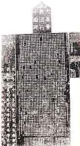 函体以平雕刀法刻画“护世四大天王”像,正面有一金锁扣和金匙,“J顶”是中国传统建筑形式之一,呈四面坡,中为四条平脊相围的平顶。以银铸成,四壁以平雕刀法刻有“护世四大天王”像,顶面有行龙两条,为流云所围。四天王形相栩栩如生,持弓执箭,各有神将、夜叉多人侍立,极其威严,使人肃然而敬。凝目而视,彷佛诱人追随函壁的画像驰骋三界,遨游九重天。 用一条约50毫米宽的绛黄色的绸带十字交叉紧紧捆扎。顶面錾两条行龙,首尾相对,四周衬以流云纹;每侧斜面均錾双龙戏珠,底饰卷草。