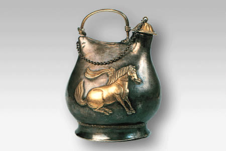 唐朝。此壶仿游牧民族的皮囊式水壶造型,通高18.5厘米、口径2.2厘米、足8.8*7.1厘米。扁圆腹,莲瓣纹壶盖,弓形提梁,一条细镀连结着壶盖与提梁,上口敛而底部呈扁弧形,壶底与圈足相接处有“同心 结”图案一周,系模仿皮囊上的皮条结,圈足内墨书“十三两半”,是壶的重量,周身看不到焊缝。最令人称奇的是在壶身中央,壶腹两侧面用模具冲压舞马图,突出于壶面的、金色的、奇异的马。这匹马身躯健硕,长鬃披颈,前肢蹦直,后肢弯曲下蹲,口中叼着一只酒杯,其上扬的马尾和颈部飘动的绶带显示出十足的动感。据考证,这是一匹正在舞蹈的马。1970年10月陕西省西安市南郊唐代窑藏出土。现藏于:陕西省历史博物馆。