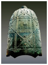 唐代。西安钟楼。全国重点文物保护单位,西安的重要标志之一。是我国古代遗留下来许多钟楼中形制最大、保存最完整的一座。因楼上悬挂铁钟一口而得名。始建于明代(公元1384年)。初建时,地址在今广济街口,与鼓楼对峙。明神宗万历十年(公元1582年)由巡安御使龚贤主持,将钟楼整体迁移于今址。因朱元璋称帝后怕全国各地出现真龙天子与其争位,因此下令修建钟楼以镇龙气。钟楼基座为正方形,占地1377.4平方米,基座用青砖砌成,楼为砖木结构,高36米,基座高8.6米,每边长35.5米,外重檐3层,内为上下两层,有楼梯可盘旋而上。在檐上覆盖有深绿色琉璃瓦,楼内贴金彩绘,画栋雕梁,顶部有鎏金宝顶,金碧辉煌。钟楼的西北角上陈列着一口明代铁钟,重5吨,钟边铸有八卦图案,建造于明成化年间(1465~1487年)。但它比钟楼早先悬挂的铜钟却小得多了。钟楼原先悬挂的巨钟是唐代景云年间铸造的“景云钟”(现藏于碑林博物馆)。据说,迁到今址之后,虽然楼的式样大小并没有改变,景云钟却怎么也敲不响了。无可奈何,只有另换。现藏于:西安碑林博物馆。