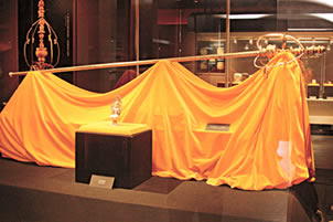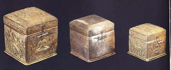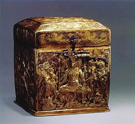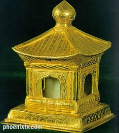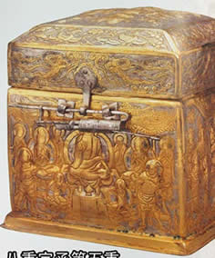 唐代。是唐懿宗赐赠的,函内盛放着一枚供奉舍利,最外层是一个檀香木函,里面套装着三个银宝函、两个金宝函、一个玉石宝函和一座单檐四门纯金塔,但因最外层为檀香木银棱(录皿)顶宝函出土时已残朽,故只见七重。层层相套的宝函其质地分别为金、银、玉、木,每层宝函外均用银锁锁上,并以丝带或绢袱包裹,金塔基的银柱就是套放供奉舍利的地方。宝函和金塔,做工精细、造型优美,精雕细琢,美不胜收,世所罕见,其价值不仅在平雕刀法、宝钿珍珠装及J顶这些古代工艺,还在于刻凿在四周壁面上的文殊、如来造型,正是佛教密宗内蕴的深刻表现,是密宗文化艺术史的一幅剪影。一九八七年农历四月初八佛诞日的凌晨一时佛指舍利被发现。现藏于:法门寺博物馆。