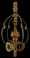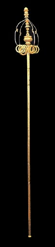 唐代。锡杖由唐懿宗供养,长1.96米,重2.39公斤,用金2两,银58两。杖身4轮套12个环,中饰柿蒂状忍冬花结座,上托流云仰莲,5钴杵及智慧珠。锡杖尊体由复莲八瓣组成,锡杖下端有三栏团花纹饰,栏之间以珠纹为界,极为精细,杖身中空,通体衬以缠枝蔓草,上面錾刻圆觉十二僧,手持法铃立于莲花台之上,个个憨憨可掬,神情动人,锡杖下端缀饰蔓草、云气和团花。杖首用银丝盘曲成双桃形两轮,轮顶有仰莲流云束腰座,上托智慧珠一枚。其中四个大环象征四谛:苦、集、灭、道;十二小环则代表十二部经。杖头为双轮四股十二环,四股以银条盘曲而成,每股套装雕花金环3枚,股侧铭刻:“文思院准咸通十四年(873)三月二十三日敕令造迎真身银金花十二环锡杖一枚,并金共重六十两,内金重二两,五十八两银,打造匠臣安淑郧,判官赐紫金鱼袋臣王全护,副使小供奉官臣虔诣,使左监门卫将军弘悫”。这枚锡杖是佛教世界的权威,属佛祖释迦牟尼,是世界锡杖之王。《锡杖经》云,佛告诸比丘:“持此杖即持佛身,万行尽在其中”。为佛门法器中的至宝,堪称世界“锡杖之王”。1987年4月,封闭一千多年的神秘法门寺地宫之门被打开,此锡杖随着被发现。现藏于:法门寺博物馆。