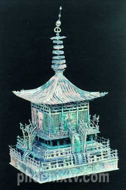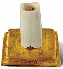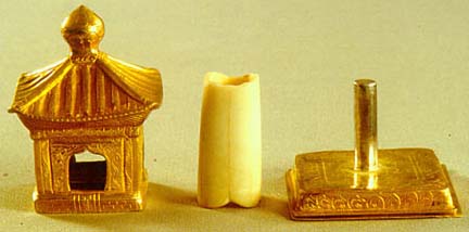 即佛指舍利所藏立之所――宝珠顶单檐四门纯金塔。金塔高105毫米,塔顶为金质莲花朵捧托金珠顶,四面檐角翘起,阁额及檐下均饰菱纹,塔身四壁刻满纹饰,并有四扇小金门,门周布鱼子纹,门下部有象征性飞梯至塔座,小巧玲珑,金碧辉煌,盘为细颈鼓腰状,喇叭口径处雕12朵如意云头,鼓腰上二平行线连为四组三钴纹杆状十字团花,衬以珍珠纹,腰底为莲瓣形,银柱托底也呈八瓣莲花状。间以三钴纹,柱底还有一墨书小字――“南”,塔座为纯金方台,中立一小银柱,用以套置佛指舍利,仅11毫米高。