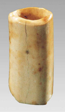 新石器时代。通长55、通高25厘米。夹砂灰陶。俯视呈鞋底形,火门上翘,椭圆形圈足。内壁横安三个粗壮支丁,三丁分别置于两侧正好对称,一丁置于后壁。两侧外壁安有一双半环形与两侧支丁连成一体。1977年河姆渡遗址T243出土。现藏于:浙江省博物馆。