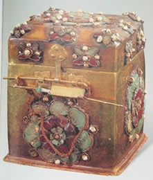 纯金雕铸,函身镶满红宝钿、绿宝钿、翡翠、玛瑙、绿松石等各色宝石,并镶嵌宝石花朵,函盖顶面和侧面红、绿二色宝石镶嵌成大大小小的莲花,通体以珍珠、宝石嵌饰,并雕上花瓣图案,极其华丽精美。