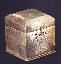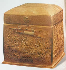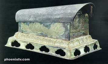 通体光素无纹,素净,不加丝毫雕刻绘描而浑然生辉,出土时有绛黄色绫带封系。盖与函体在背后以铰链相接,是八个宝函中最特别的一个。