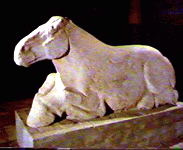 西汉。高144,长260米,头部平仰,一只前腿向前伸出,马蹄用力 着地,另一只前腿微屈抬起,准确细致地表现了卧马由静面动的动作过程,挽起的马尾,突出战马的特点,庞大的驱体,成为一种顽强不屈的力量的象征。现藏于:茂陵博物馆。