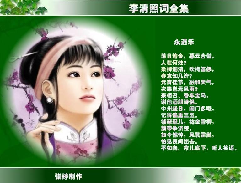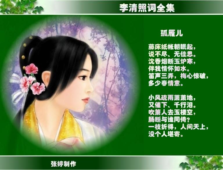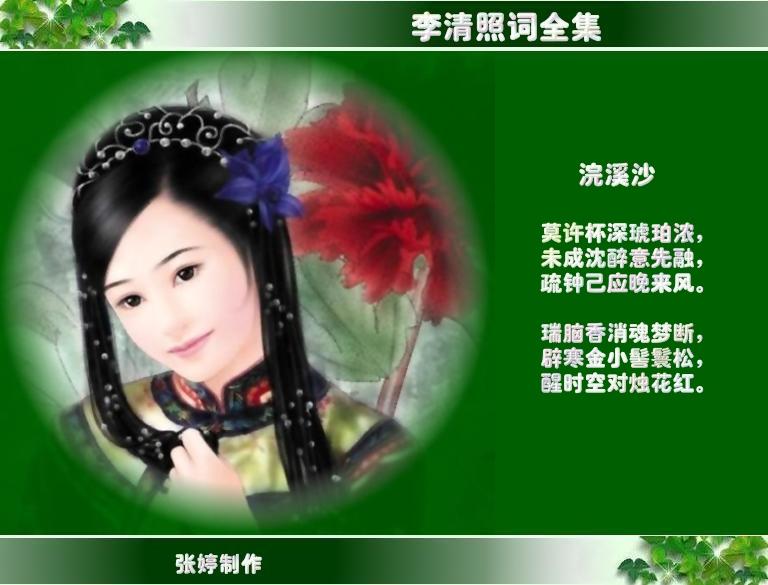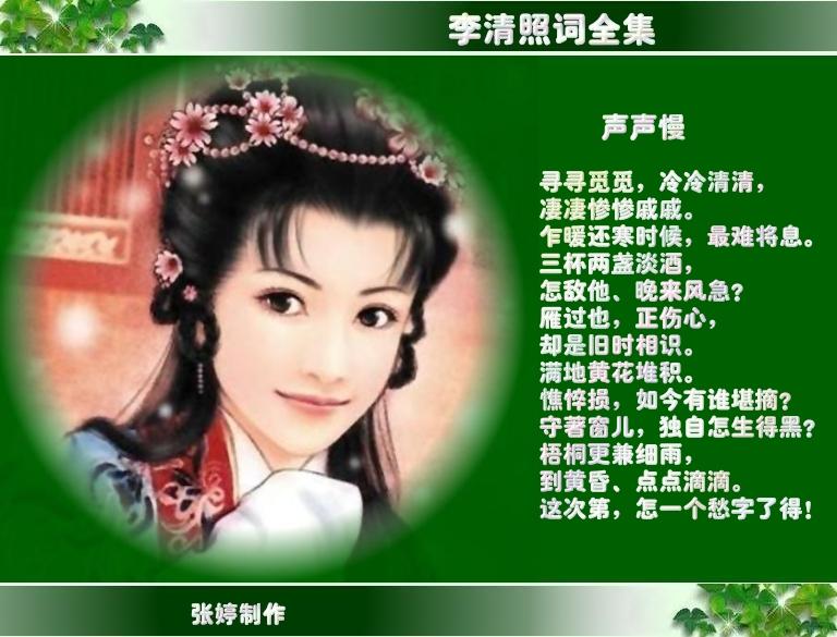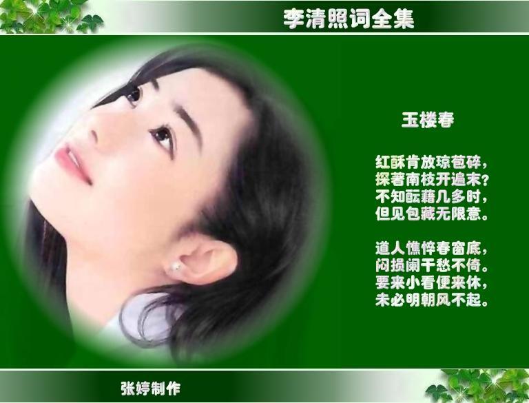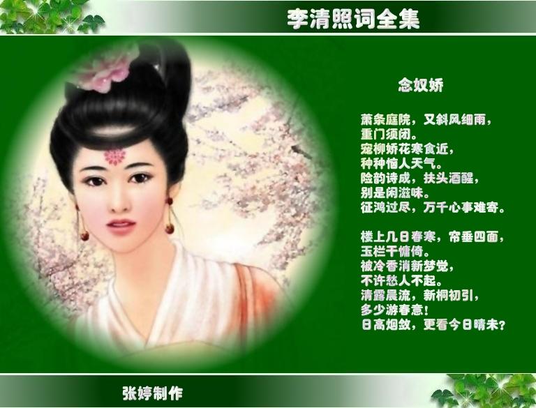 书 书生一个 荣誉会员 荣誉会员 注册 2004-12-16 帖子 2,467 反馈评分 3 点数 61 2007-02-02 #16 李清照少女时的诗写得好,毕竟少年情怀总是诗吧. 南渡后,中年后,随着处境因窘,其诗意境较为凄凉.叫人同情.