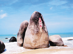 钱币上的图案做了艺术处理――让巨石屹立在大浪之中,显得雄浑壮观,实际上这块石头的位置是在沙滩上。科学家说近年气候变暖海面上升,也许有一天2元人民币上的图案会变成现实。“南天一柱”据说是清代宣统年间崖州知州范云梯所书。