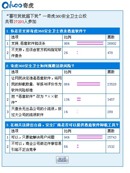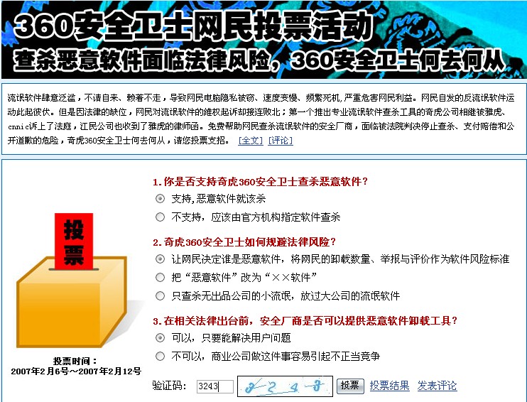 据悉,此次投票活动主要是征集三方面的意见,包括"你是否支持360安全卫士查杀恶意软件"." 在相关法律出台前,安全厂商是否可以提供恶意软件卸载工具"."奇虎360安全卫士如何规避法律风险".这也是目前关于恶意软件治理方面争议最大的几个问题,奇虎公司希望能从网民的态度上找到最终答案.
