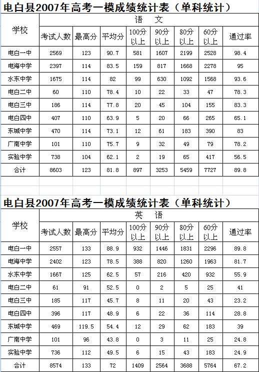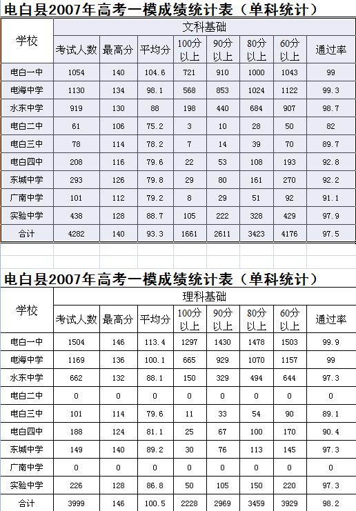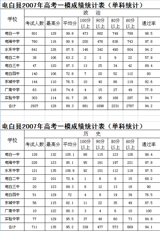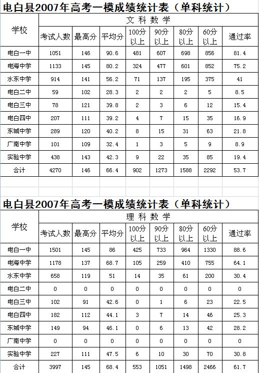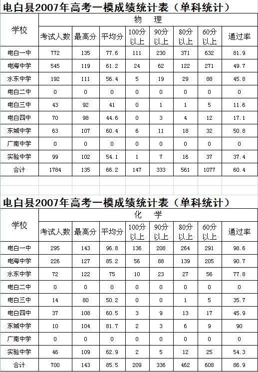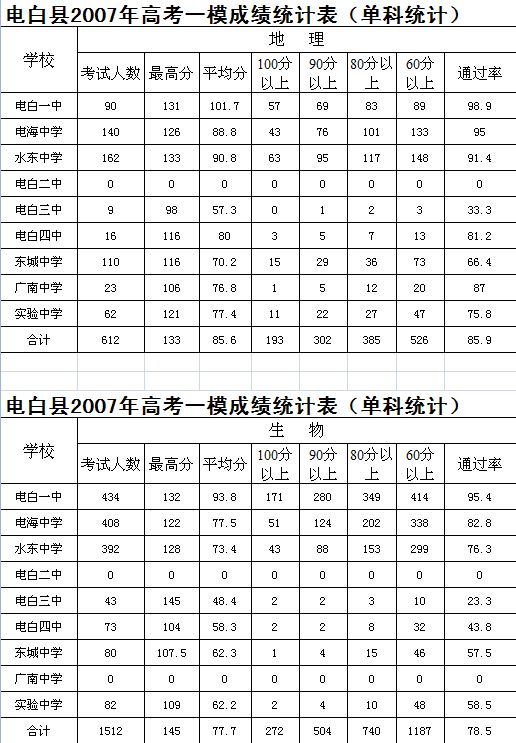 1、此表并非最后的正确统计表,特别是在“通过率”一项,每次统计,我是分别从程序中输入不同的参数,如60分以上、80分以上、90分以上……从而得到不同的分数段人数,再综合县当年的高考目标等因素,划定完成目标的“通过率”,所以此表只是计算过程中的一个半成品,并不代表60分以上就是真正的“通过率”,如有的科目最后发到学校的正式统计表中“通过率”是80分以上。